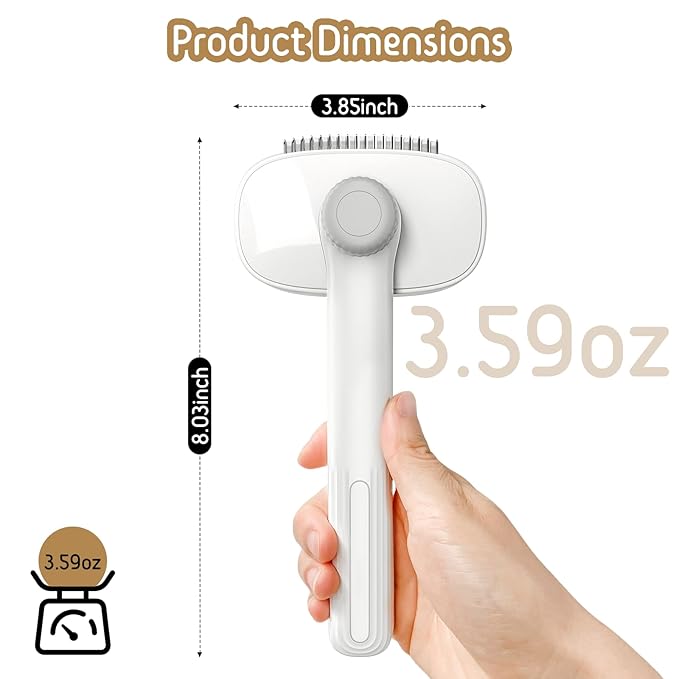 - One-click Cleaning Button: After brushing your pet, simply click the button. The shutter will pop out, separating the brushed hair from the metal needle, then wipe the hair off. The button of cat shedding brush on the handle saves time and energy when grooming and cleaning