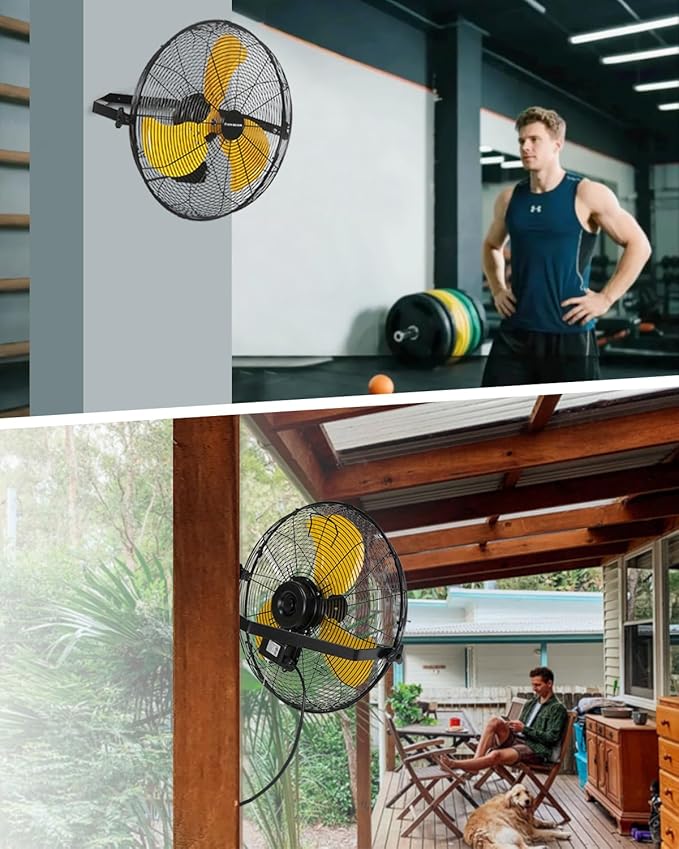 - 360 degree vertical tilting wall mounted fan indoor that easily adjust to direct the airflow to suit your environment and comfort level. Ideal for gyms,homes,garage,workshop,patio or anywhere you need to beat the heat.