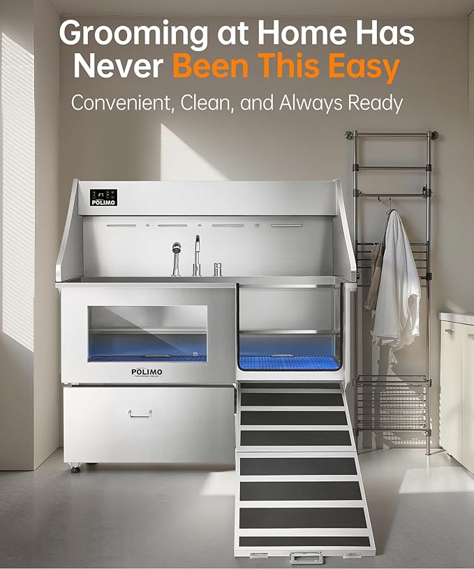 - Premium Stainless Steel Build & Smart Design : Crafted from rust-resistant 304 stainless steel with a full-welded, leak-proof structure, this dog tub is built to last. It features a Grade-A tempered glass viewing window (Eases pet anxiety); A foldable ramp (For easy access, especially for senior dogs); A removable two-piece floor grate (3 height adjustments for large, medium, and small dogs); And a sliding storage drawer (Keeps grooming tools organized). Every detail is designed for a more professional, comfortable, and efficient dog shower tub experience