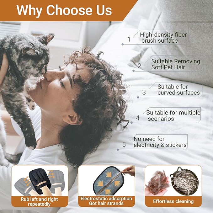 - 【Electrostatic deep cleaning with a dual-textured】High-density brush surface targets embedded hair in fabrics. It attracts surface loose fur through frictional static electricity while capturing deep-seated pet hair. Suitable for furniture upholstery, carpets, curtains, pet beds, cat trees, and car interiors