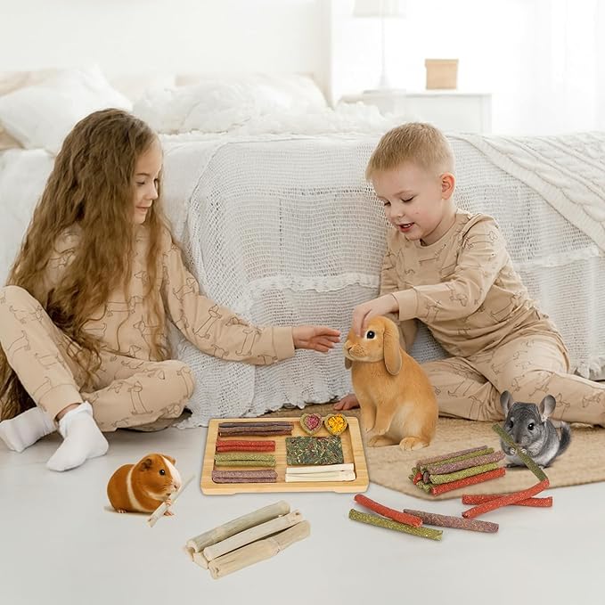 - Rabbit Toys List for Bunny Treats - Bunny toys contain: 4 x Dandelion Timothy Hay Crisps, 5 x Sweet Bamboo Sticks, 110g Apple Sticks, 7 x Timothy Hay Sticks, 7 x Flower Timothy Hay Sticks, 7 x Strawberry Timothy Hay Sticks, and 5 flavors Timothy Hay Cakes. Guinea pig chew toys total quantity is above 60 pieces, able to meet furry friends long-term teeth chewing needs.