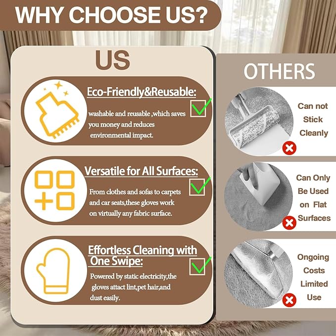 - 【Electrostatic Hair-Lifting Technology】Experience effortless pet hair removal with our electrostatic pet hair remover glove. The built-in static charge actively attracts and locks cat/dog hair from deep fibers, eliminating the need for sticky rollers or chemical sprays. Works instantly on contact - just glide your hand over surfaces!