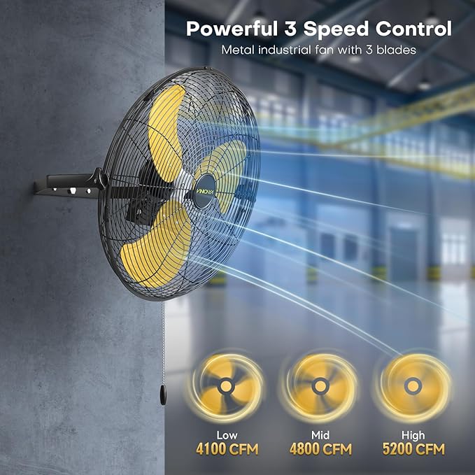 - 3 Speed Settings for Your Needs: Customize your cooling experience with low (4100 CFM), medium (4800 CFM), and high (5200 CFM)-speed options, catering to different needs and preferences—whether for normal circulation or intense airflow of the wall mount fan