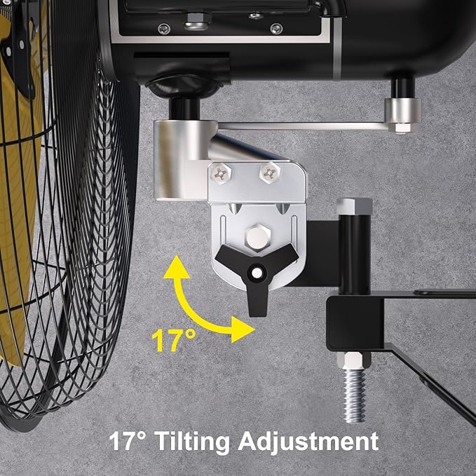 - Adjustable Tilting and Oscillation: Cool every corner with the fan's 80Β° oscillating airflow that moves back and forth. And with the option to 17Β° tilt or within it, achieve the better air placement for your comfort. So Just enjoy a cooling summer. This is an industrial wall mounted fan, the noise is louder than home fans, but less noisy than most of the same size industrial fans