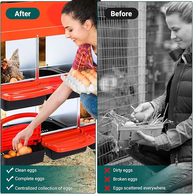 - CONVENIENT EGG COLLECTION MECHANISM: The unique tilting design of this nesting box allows the eggs to roll automatically into the collection tray for quick and easy egg collection. Say goodbye to tedious manual egg picking, you can easily access fresh eggs while ensuring they are intact.