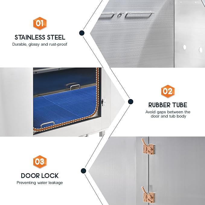 - Leak-Proof Design: The 50-inch dog wash station suits pets of various sizes, featuring seamless welding, secure rubber tubing, and locking doors to prevent leaks and escapes.
