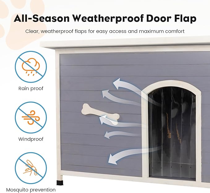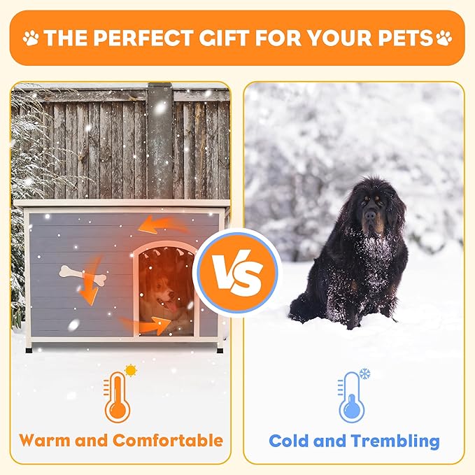 - [Specially Designed for Outdoor Use] The sloping asphalt roof is expertly engineered to prevent rainwater from pooling, ensuring that your pet's living space remains dry and comfortable. The floor is 2.4ββ above the ground, and there is a removable PVC curtain and adaptable floor pads for uneven ground. This design enables the dog house to withstand harsh weather conditions, preventing water from seeping in and materials from getting damp