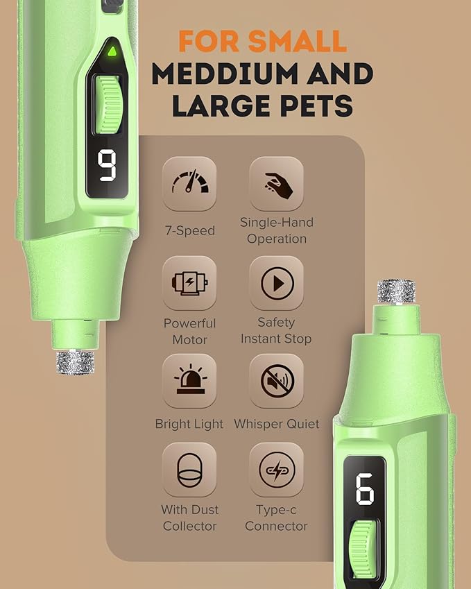 • 7 SPEEDS ADJUSTABLE: Ranging from 8,000 to 15,000 RPM, as one of the most powerful grinders, ideal for trimming the nails of small, medium, and large dogs, cats, birds, and other small animals